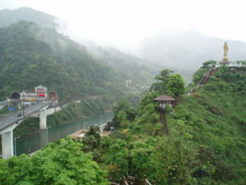 大约10分钟,就爬上了观音台。观音台立有一座四十尺高,以青铜铸造的观音圣像,下方另一平台,有一圆顶的殿堂,祀奉观音神像。观音台上,居高临下,眺望远近山水,俯瞰坪林聚落,景色怡人。观音台步道沿途亦无遮荫,阴凉天气或雨中来访皆宜,惟不宜艳阳高照日。