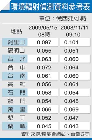 台电表示,“原能会”对核能发电的安全管制非常严格,除了在核能电厂周遭有相关侦测外,台湾各地也都有环境辐射侦测。这项侦测结果显示,各地环境辐射侦测得的最高值在阿里山,每小时剂量约0.1微西弗。反观,现有四座核能电厂所在地,以及低放核废料贮存场所在的兰屿,环境辐射值并不高,其中兰屿的环境辐射值甚至位居各地侦测值“最低”。