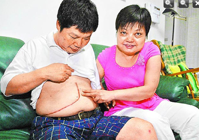 陈荣同在2001年捐出左肾救了肾功能恶化的妻子,妻子原右肾保留,新右肾移植在靠近骨盆处。