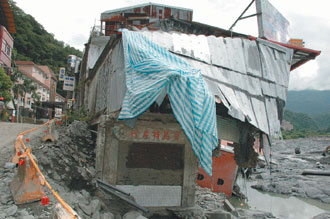 这次被冲走的便利商店老板赖冠谕,昨天下午指着倒塌的金帅饭店基地,出现一排被埋在土石堆里的民房。他说,“这些房子三十七年前被土石掩埋”。
