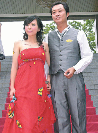 新郎颜志达为实现承诺,问到女友工作的度假村,总经理答应,活蝴蝶先以纸张包起来,冰在7℃低温2小时,让蝴蝶类似冬眠般昏睡,再取出“贴”在礼服上,蝴蝶则是利用冰冻的水气贴在衣服上。
