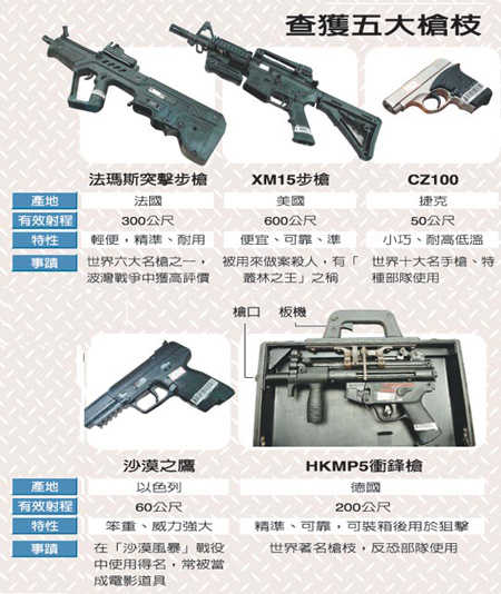 不乏岛内首见的枪型中,例如手提箱式MP5冲锋枪,可从手提握把直接扣扳机,外观与一般手提箱无异,使用者提着它走进人群,就算是“总统级”的维安也防不胜防,故有人称它“要命的手提箱”,黑市价格应在百万元以上,警方认为订货者动机可疑,准备用它来刺杀谁,有查明必要;另有9把以色列突击步枪,浸泡海水后可立即使用,也是首次查获。