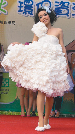 模特儿身上穿的有统一发票制成的小洋装,也有用废面膜、废雨伞布、废布、旧童装拼成的美丽衣裳,连包装尼龙绳也可以制成马甲,饮料罐成为皮带、饰物,令观众惊艳!环保局长刘伯舒形容,这是垃圾变黄金的最好展示。