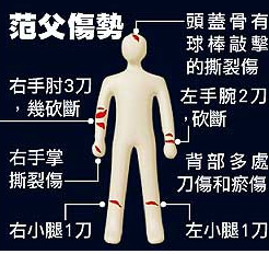范姓少年一开灯、林就持铝棒重击熟睡中的范父头部,连续敲打四、五下;范见父亲抱头抵挡,即持西瓜刀朝他身上一阵猛砍,因用力过猛,连刀柄都砍断了,直到父亲不支倒地才罢手。