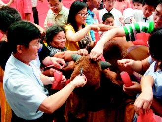 中新网9月29日电 据台湾《联合报》报道,二十八日是孔子两千五百五十九周年诞辰,台北市孔庙举办盛大祭孔大典,年仅三十五岁的孔子第七十九代嫡孙孔垂长首次担任奉祀官。台北市今年特别恢复暌违十二年的拔智慧毛活动,两千支毛笔挂在智慧牛身上,让民众排队领取。