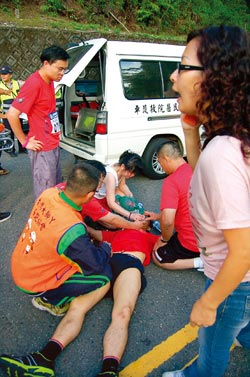 距离求婚会场二公里外、半小时前,蔡乔治(男,五十岁)却与生命拔河。他参加六公里组,沿着日月潭逆时针方向通过水社坝堤约一公里,突然倒地昏迷,脸色苍白。救护人员立即施予心肺复苏术,并以气球灌氧,自动电击器刺激,意识仍未恢复。