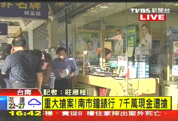 中新网11月23日电 据台湾TVBS报道,台南市一家钟表行老板,23日下午到银行提领新台币7000万元现金,准备买黄金用,没想到回家途中遭歹徒尾随,回到店内时歹徒开枪抢走现金,流弹还意外波及在店内的老板侄女,侄女小腿中弹,送往成大医院急救,歹徒则逃逸无踪。