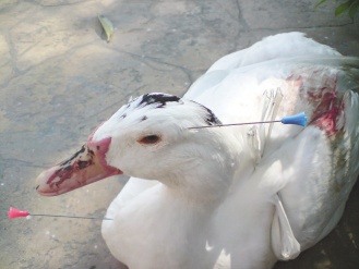 何吉盛说,二十四日深夜,小区民众发现有三名年轻人疑用吹针攻击番鸭,隔天即见三只鸭中了二到三支针,受伤部位在头、颈部,其中一只在池中打转,奄奄一息;民众将它救起,拔出针后,就一命呜乎了。