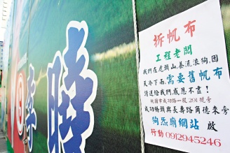 桃园市区大型选举广告牌下端,连日被贴了索取告示:“拆帆布老板,我们在虎头山饲养流浪犬,因为天气寒冷,如果旧帆布不再需要,请送给我们,感恩不尽……”