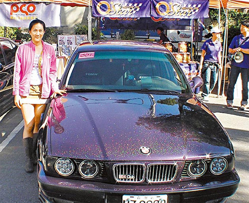 昨天上午,来自全台各地的BMW E34车主和家人在月眉糖厂集合,平时只在网络交流心得的车主互相自我介绍、打开爱车引擎盖观摩讨论,一名车主在爱车写上“王”,意指“BMW E34才是王道”。
