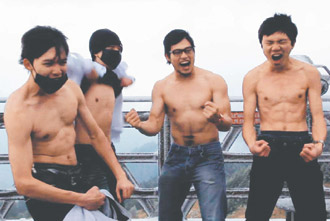 学生们在景观台上一字排开,女同学一声令下,有3人先脱掉上衣,露出结实的肌肉,但第4人仅做象征性的配合,将胸前的衣服拉高,脸部还戴着口罩,遭到女同学大声纠正。