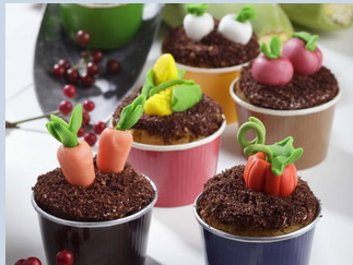 蛋糕以绵密Q弹的海绵蛋糕为基底,再铺上一层厚厚的巧克力饼干末,创造出如泥土的真实感,田地上的作物则代表杯子蛋糕不同的口味,红艳的草莓,是草莓口味杯子蛋糕、玉黍蜀是甜玉米面包、白萝卜则是香草、红萝卜就是红萝卜杯子蛋糕、水蜜桃则为香草杯子蛋糕加水蜜桃果粒、还有南瓜口味的南瓜杯子蛋糕。