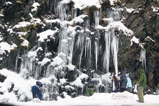 中新网1月6日电 据台湾《联合报》报道,寒流接连来袭,合欢山积雪厚达二十厘米,昨天(五日)山上虽未下雪,但北国风情美景吸引民众涌上山欣赏,一处山谷流水结成冰瀑,瀑柱晶莹,被称为“水晶宫”,是合欢山上最吸睛的雪景。而远处山庄的屋顶彷佛漆上白漆,路面则成了滑雪场。