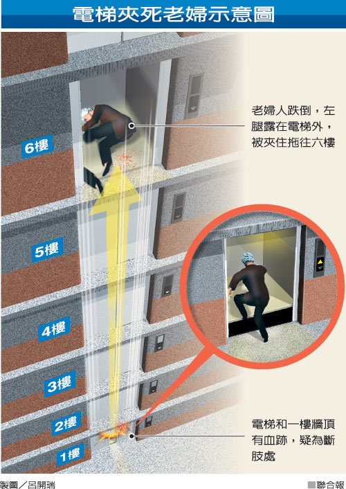 中新网1月13日电 据台湾《联合报》报道,桃园县七十岁妇人朱苏贵美前天要到妹妹住处聊天,在一楼搭电梯时,因电梯地板比一楼地板高出一截,进电梯时不慎跌倒,左大腿卡在电梯外,被夹住拖上六楼而断腿,送医后仍因失血过多死亡。
