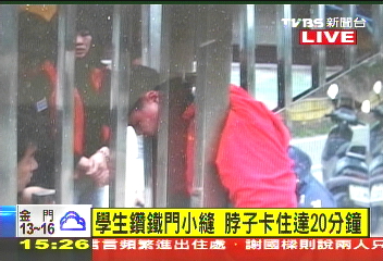 中新网3月17日电 据TVBS报道,台湾苗栗县后龙中学发生铁门夹伤学生意外,一名男学生下课后,转身要回校内拿课本,结果电动铁门关到只剩小缝隙,男学生脖子当场被夹住。