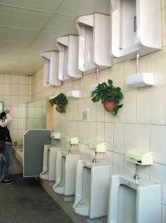 “咦! 小便斗、马桶怎么倒置在墙上、天花板?”走进台湾醒吾技术学院的厕所,如果抬头看,恐会一时反应不过来,以为眼花了,天花板又是地板,地板是天花板,人仿佛变成倒立站在天花板上厕所了。