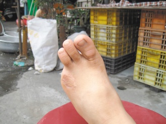两年多前,阿志满脚鲜血回家,吓到父亲,紧急连络他姑姑前来协助,姑姑看到他左脚两根脚趾被齐平剁断,紧急将他送医,由于找不到脚趾可缝回,从此左脚缺了两根脚趾。