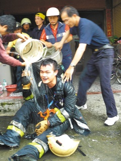 火势逐渐控制后,消防第一大队救助分队长吴宏毅与队员持续向仓库门口喷水降温,记者在附近采访,突然瞬间闪燃,蹲站在第一线的消防人员被巨大的热气撞倒受伤,情势紧急,其余队员立即上前将伤者拖离现场送医。