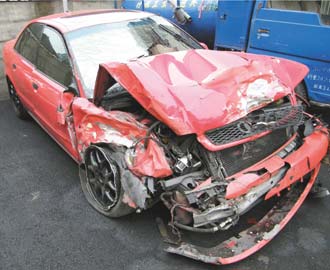 中新网4月16日电 据台湾《联合报》报道,台中县25岁许姓男子昨日(15日)开车送女友上班时,被巡逻员警发觉车子前后都没有车牌,他拒绝停车受检,一路狂飙连撞4车,撞到车头全毁才停下,原来他是无照驾驶,害怕受罚才想加速逃逸,却造成百万(新台币)进口车变成废铁,还要面对巨额罚款及赔偿金。