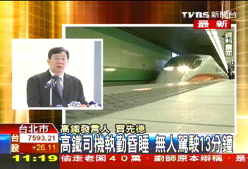 中新网5月10日电 据台湾TVBS电视台报道,台湾高铁惊传有驾驶员执勤时在驾驶舱里睡着,一列从左营开往台北的列车,有13分钟几乎是“无人驾驶”的状态,以时速将近300公里的速度飞奔40多公里,最后靠着自动驾驶装置,紧急停靠台中站,结束一场虚惊。