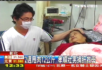 中新网5月10日电 据台湾TVBS电视台报道,彰化一名37岁男子, 2个礼拜内甩肉12公斤,为的是要捐肝救妈妈。他的母亲因为C型肝炎昏迷急需换肝,家中小孩只有二儿子的血型和母亲相符,但他体重102公斤,肝脏被油脂包覆,他下定决心减肥,2个礼拜内减到剩90公斤,成功捐肝。