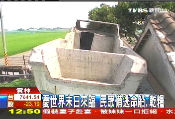 美国卖座电影《2012》预言世界末日即将到来,大楼倾倒、海水淹过陆地,天崩地裂场景让人震撼,现实生活中,有人真的担心世界末日来临,已经准备好逃难物品。民众廖文捉:“这就是要备水用的,一般船只,这个就是要备水用的。”