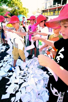 游行队伍在傍晚时走到凯道前集合,不少学生身穿考卷制成的衣服,象征被考试压着喘不过气,最后把考卷揉团丢向空中,盼不再生活在考试的阴影下。