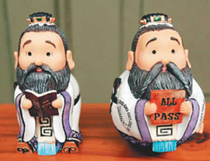 睁着大眼睛,圆滚滚的孔子拿着All Pass的牌子,看起来超级可爱,火暴的公仔热现在也吹进台北孔庙,孔子大变身,彻底颠覆传统,也大抢考试商机。民众一出手就是好几百元,还直说,“我觉得应该有加持作用,保个心安吧!”