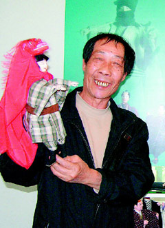 台湾著名布袋戏艺术家李传灿在其父李天禄的布袋戏文物馆。图为李天禄生前表演的布袋戏《乾隆游西湖》片段。 中新社发 陈立宇 摄