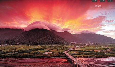 宜兰南澳小学老师蔡沛旻昨清晨5时许,拍到南澳山区满山火云,染成血红的山头向苍穹激射出万道红光,仿佛火山爆发漫山熊熊烈火、又似盘古开天的气势,加上云彩翻山越岭,气势壮丽磅礡,美妙的天象只维持5分钟,已让人惊叹不已。