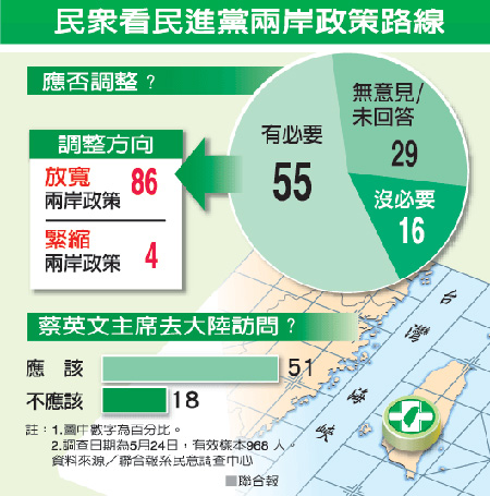 随着陈菊访问大陆,民进党的两岸政策路线成为新的话题。调查显示,五成五民众认为民进党有必要调整对大陆政策,一成六觉得无此必要;其中,认为民进党应调整路线者,八成六主张民进党放宽两岸政策,仅百分之四觉得应更为紧缩。