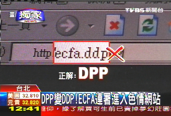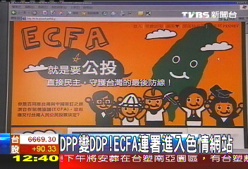 中新网7月2日电 据台湾TVBS报道,两岸经济架构协议(ECFA)在岛内引起争议,民进党表达抗议发起ECFA“公投”联署。只是宣传ECFA“公投”的网站,现在却被发现出现山寨版,网址民进党的英文缩写DPP变成DDP,一点进去竟然是露点色情网站,民进党当然尴尬。