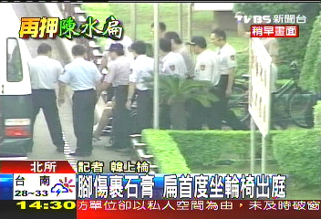 台北地院13日裁定第三度延押陈水扁,15日提讯陈水扁就机要费案提示卷证,陈水扁一开始先抱怨自己的脚伤遭到台北看守所误诊,又称被关在看守所内没有司法、医疗人权。陈水扁还讥讽审判长蔡守训,不要第四次延押,又拿他脚伤的事来当作理由。