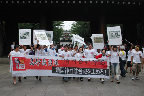 “还我祖灵队”接着在大广场上高歌“安魂曲”、吊祭早年被强迫合祀于靖国神社的祖先。他们在广场停留近30分钟后列队步出靖国神社正殿,搭车离开现场。
