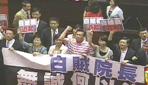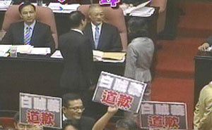 据台湾TVBS报道,吴敦义还没上台,事前保密到家的民进党“立委”们,突然拿着白布条、标语霸占主席台,大喊“白贼义,道歉”,称吴敦义香港行的说法一变再变,有诚信问题。吴敦义则留在原位,国民党人上前安抚,也做护驾动作,避免与民进党“立委”发生肢体冲突。