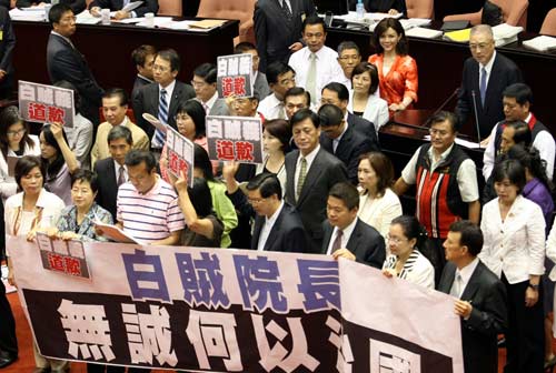 据台湾媒体报道,吴敦义上午就来到“立法院”准备报告施政方针,但还没上台,事前保密到家的民进党“立委”们,突然拿着白布条、标语霸占主席台,大喊“白贼义,道歉”,称吴敦义香港行的说法一变再变,有诚信问题。吴敦义则留在原位,国民党人上前安抚,也做护驾动作,避免与民进党“立委”发生肢体冲突。
