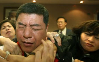 就在张庆忠宣布休息片刻后,国民党“立委”杨琼璎、陈淑慧、罗淑蕾等人站上主席台,与民进党“立委”林淑芬等人对峙,张庆忠则在国民党“立委”林益世等人团团包围下重新站上主席台,宣布继续开会,并由议事人员完成法案逐条宣读。