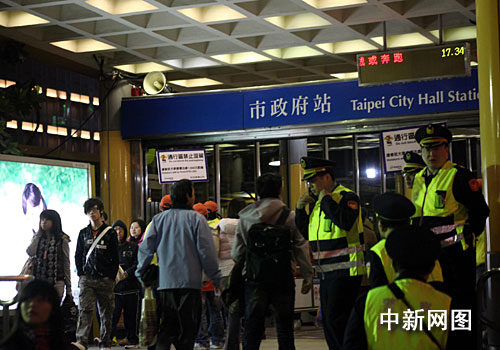 12月31日,为疏导跨年夜到台北市政府观看晚会和观看一0一大楼烟火秀的人潮,警察早早就来到捷运市政府站门口维持秩序。 作 者:陈立宇