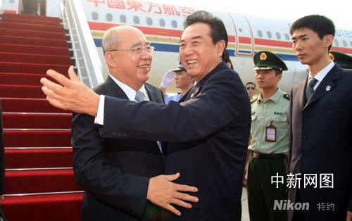 5月26日,中国国民党主席吴伯雄抵达南京,中共中央台湾工作办公室主任陈云林到机场迎接。盛佳鹏 摄