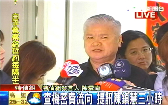 特侦组发言人陈云南表示,借提陈水扁任内出纳陈镇慧、前陈水扁办公室主任林德训出庭,最主要是要厘清整个机要费的流向以及金额细节部分。(图片来源:台湾TVBS)