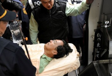 陈水扁禁食5天,16日晚间被戒护送往医院治疗,17日早上在警力戒护下转院继续治疗。(“中央社”图)