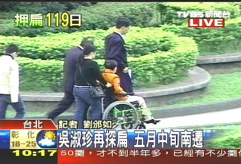 中新网4月27日电 据台湾TVBS报道,陈水扁妻子吴淑珍传出在5月20日以前,就要南迁到高雄新家,今天(27日)儿子陈致中也特别北上,和吴淑珍一起探望陈水扁。