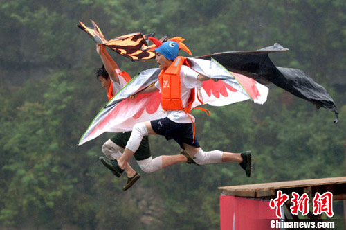 中新社东莞9月14日电 (李映民 李获 张良玉)身披像风筝一样的飞鸟翅膀,像一只大鸟一样,站在高5米的跳台上,用各种姿势飞跃而下。广东东莞首届鸟人跳水大赛今天在水濂山乐民水上乐园拉开战幕,大赛将一直持续到国庆黄金周结束,这方面爱好者可以免费参加。