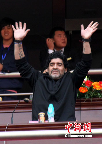 中新社济南11月5日电(牛杰峰)5日下午16时左右,世界球王马拉多纳来到山东济南奥体中心参加山东联队与阿根廷明星队的慈善比赛。尽管姗姗来迟约一个小时,但是铁杆“粉丝”们的热情仍然不减。