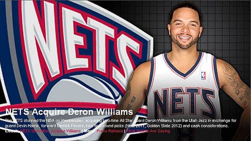 爵士送出当家控卫德隆-威廉姆斯,得到篮网的德里克-费沃斯、德文-哈里斯以及两个首轮选秀权。作为交易的一部分,篮网还会送出300万美元现金。此外,篮网还将合同到期的特洛伊-墨菲送到勇士,得到内线丹-加祖里奇和布兰登-莱特。