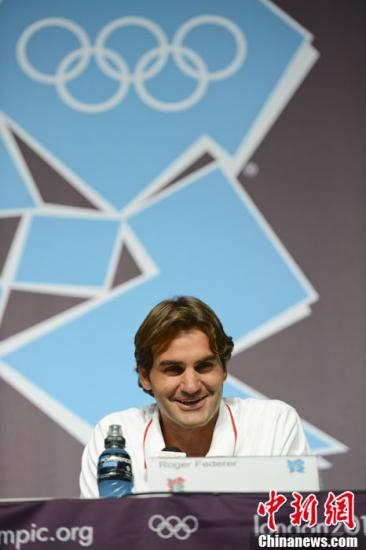 当地时间7月26日,瑞士网球名将费德勒在伦敦奥林匹克公园主新闻中心出席新闻发布会。记者 廖攀 摄。