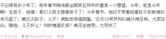 黄健翔:不记得有多少年了,每年春节陶伟都会跟我互拜年时重复一个愿望:今年,就是今年啊!生孩子、结婚!哥们儿我太想要孩子了!今年春节,他终于带着挺着肚子的新媳妇来见面了:瞧这尖肚子,儿子!满脸的幸福甜蜜。这月15号梦舟队踢沙滩足球,大家还问:陶指,儿子好么?何时摆酒庆祝?真无法接受,太突然了。