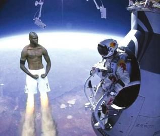 这组PS照片里,上镜最多的,还是体育圈明星,在意大利队又大出风头的巴洛特利自然不会被遗忘。欧洲杯怒吼秀肌肉的照片,即便在高空也那么劲爆,于是,巴神脚蹬火箭,在高空陪着鲍姆加特纳思考人生。此外,鲍姆加特纳高空下降过程中四肢舒张的照片,和特里凌空抽射的动作有些神似。而英国跳水明星戴利也被PS到了飞行器上,如果戴利真的从这里纵身一跳,那够他团身抱体、屈体、侧身翻腾2460周半了。