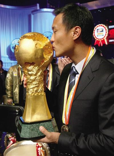 2009年12月4日,徐云龙亲吻火神杯。新京报记者 吴江 摄