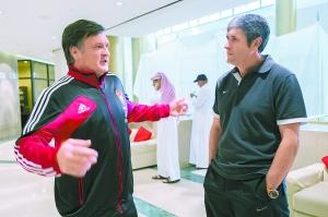 新闻发布会前,卡马乔与沙特主帅、前皇马同事热聊。